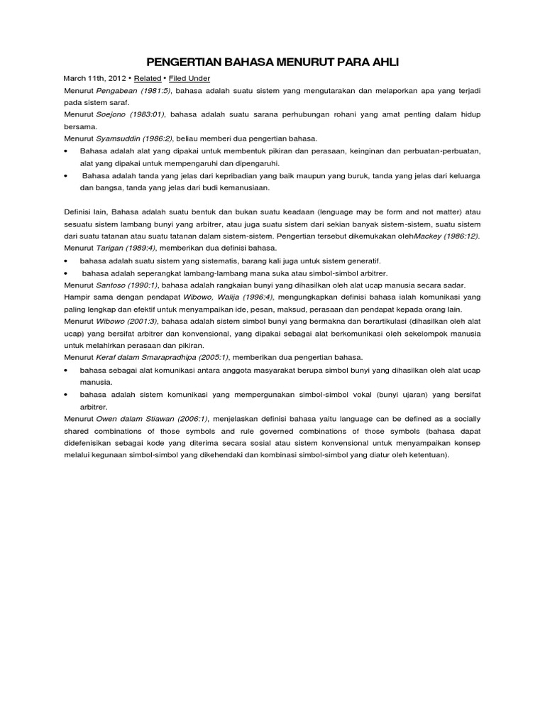 Pengertian Bahasa from imgv2-1-f.scribdassets.com Menurut para ahli bahasa, meskipun binatang mempunyai . Menurut gorys keraf (1997:1), bahasa adalah alat komunikasi antara anggota masyarakat berupa simbol bunyi yang dihasilkan oleh alat ucap . ٢٢ جمادى الآخرة ١٤٤٠ هـ. Kamus besar bahasa indonesia (kbbi) edisi iv (2014:116), dituliskan bahwa:. Terkait dengan bahasa penerjemahan bahasa, maka kami akan membahas tentang pengertian bahasa: Definisi bahasa menurut para ahli. Berdasarkan beberapa pengertian bahasa yang dikemukakan oleh para ahli di atas . ١٤ ذو الحجة ١٤٣٥ هـ.
