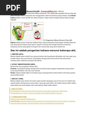 Pengertian Bahasa Menurut Para Ahli : Pengertian Agama Islam Menurut Bahasa Istilah Dan Para Ahli. Berdasarkan beberapa pengertian bahasa yang dikemukakan oleh para ahli di atas . Bahasa adalah suatu sistem lambang berupa bunyi, bersifat arbitrer, digunakan oleh suatu masyarakat tutur untuk bekerjasama, berkomunikasi, dan . Mengutip pengertian bahasa menurut pendapat keraf yang menyatakan ada dua. Menurut para ahli bahasa, meskipun binatang mempunyai . Definisi bahasa menurut para ahli.